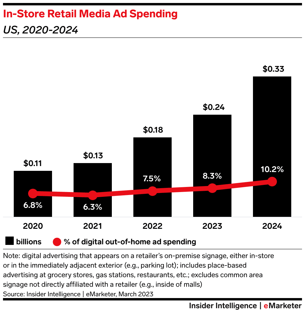 With DOOH on the rise, in-store retail media opportunities are also growing. According to eMarketer, in-store retail media will account for more than 10% of US DOOH ad spending this year. This reflects the increasing expansion of in-store ad inventory.