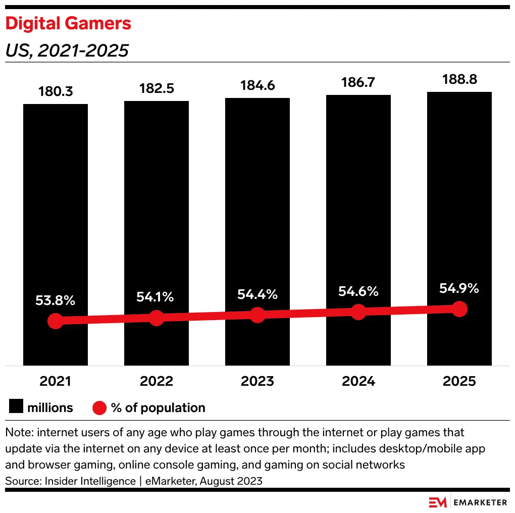 According to eMarketer, more than half (54.6%) of the US population will be digital gamers in 2024.