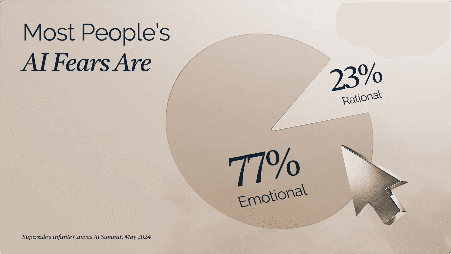 Yet, despite this growing adoption, emotional barriers and a lack of understanding about how to effectively use AI persist. Despite the fact that the majority of people today use AI at work (75%), many people fear AI. Yet 77% of the people who fear AI admit that those fears are emotional rather than rational, reflecting that, as is often the case—us humans are the problem.